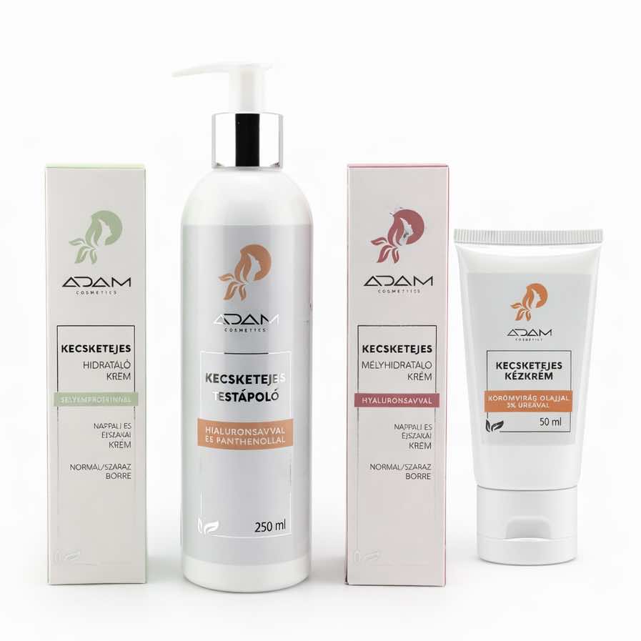 A szett tartalma: Kecsketejes hidratáló arckrém selyemproteinnel (50ml) Kecsketejes mélyhidratáló arckrém hialuronsavval (50ml), Kecsketejes testápoló hialuronsavval és panthenollal (250ml), Kecsketejes kézkrém körömvirág olajjal 3% ureával (50ml)
